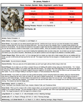 | filed under: D&D, RPGs, Dungeons and Dragons, Sir James, Dungeons & Dragons, Role Playing Games, AD&DMy Dungeon Master (DM) is awesome. After the game—during which I was played as an NPC (Non Player Character) because I couldn't make the game—he wrote me the most amazing recap and also updated my character from level 3 to level 4 and sent me my updated character sheet in a gorgeously-rendered PDF (inline, attached below). Enjoy! Real names have been erased to protect real people.