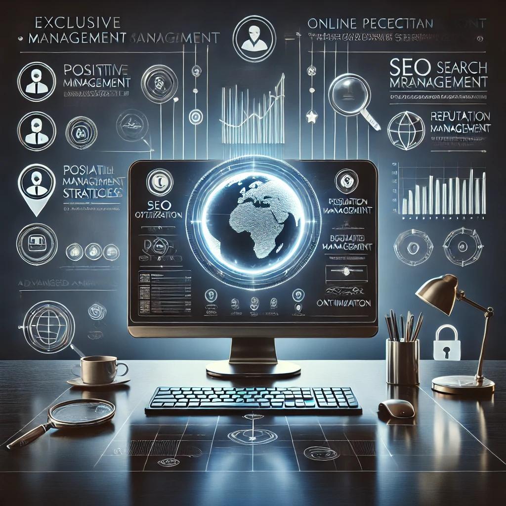 A sleek and modern illustration representing Exclusive Online Perception Management services for accomplished professionals. The image showcases a digital workspace with a glowing computer screen displaying advanced SEO analytics, positive search results, and personal branding strategies. Surrounding elements include icons for reputation management, content creation, and global connectivity, symbolized by a globe with interconnected lines. A shield and lock highlight confidentiality and security, while the overall design reflects professionalism, trust, and exclusivity.