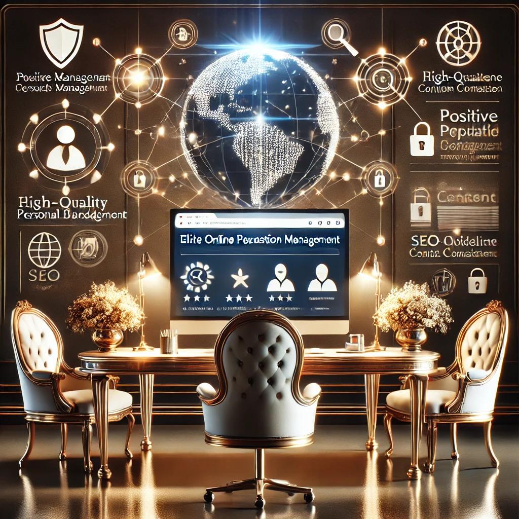 A sophisticated and professional illustration representing Elite Online Perception Management services tailored for high-net-worth individuals. The image showcases a luxurious digital workspace with a sleek computer displaying positive search results, personal branding content, and analytics. Surrounding elements include icons for SEO optimization, crisis management, and bespoke content creation, symbolizing tailored strategies for digital reputation. A glowing globe and interconnected nodes emphasize global reach and influence, while shields and secure locks highlight confidentiality and protection. The design exudes trust, discretion, and aspirational success.