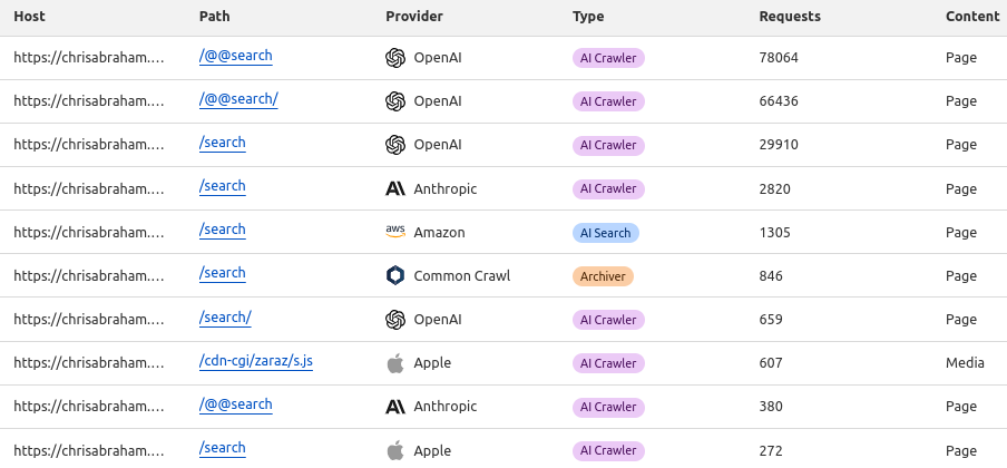 Popular Paths on chrisabraham.com seen via the AI Bots via CloudFlare AI Audit beta